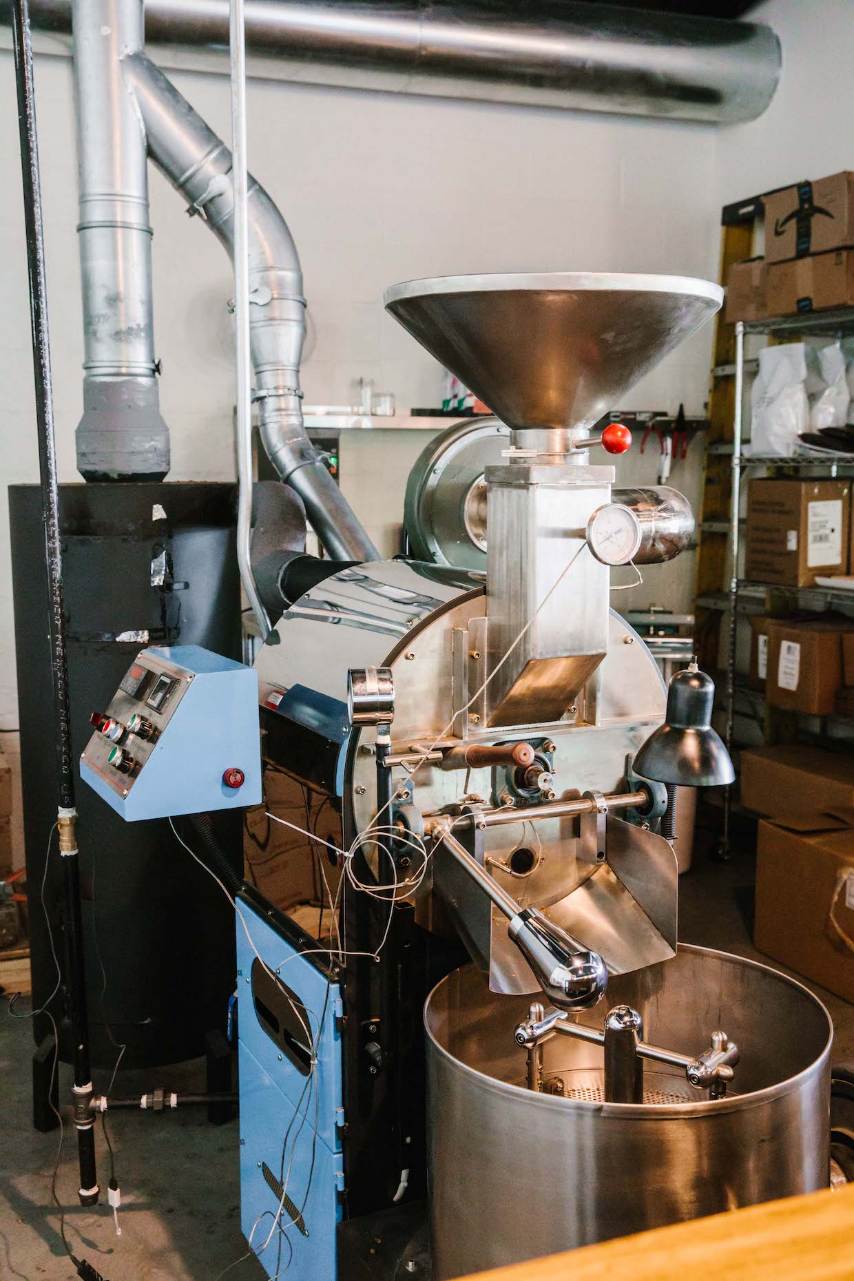 The 1,800-square-foot Helm headquarters maintains an industrial production feel with concrete floors, cinderblock walls, exposed rafters and a Mill City Roasters machine installed next to sacks of green coffee.