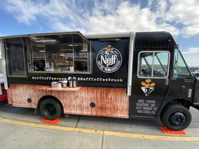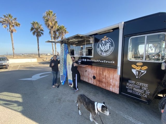 The father-son duo of David and Matthew Neff hoisted the retail window up for the first time on the Neff electric hybrid 2001 Freightliner MT45 last month, sending the smell of roasting coffee up into the eucalyptus breeze at Grape Street Dog Park, the largest of three dog parks in San Diego’s expansive Balboa Park.