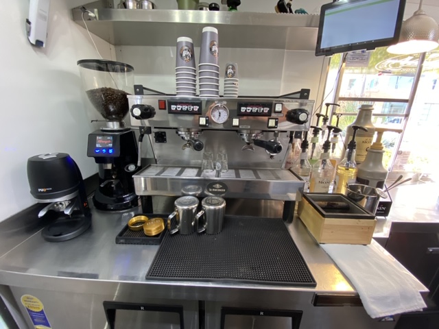 That blend is roasted onboard daily and crafted into drinks ground by a Fiorenzato F64 Evo espresso grinder, auto-tamped by Puqpress and extracted on a classic La Marzocco Linea. A Bunn brewing system delivers larger batches of quicker cups of drip.