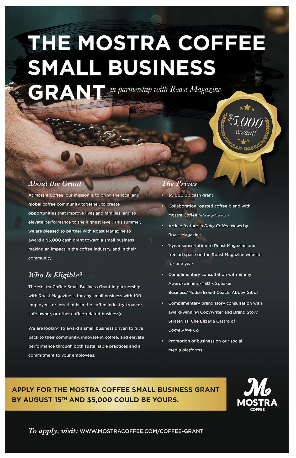 The Mostra Coffee Small Business Grant in partnership with Roast magazine is for any small business with 100 employees or less that is in the coffee industry (roaster, cafe owner, or other coffee-related business).