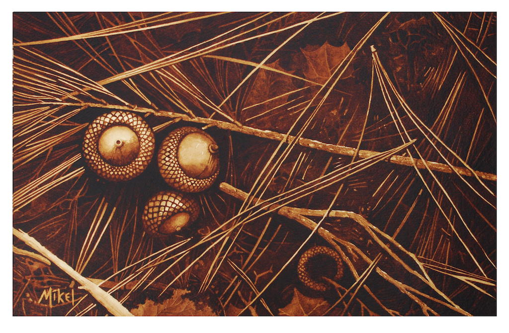 Mikel has been employing coffee in his abstract and realist pieces since 2008, at first in an effort to reduce waste generated by a coffee-drinking family member. Ironically, Mikel’s coffee-based pieces eventually began to sell so well that he had to generate more waste to fill canvases.