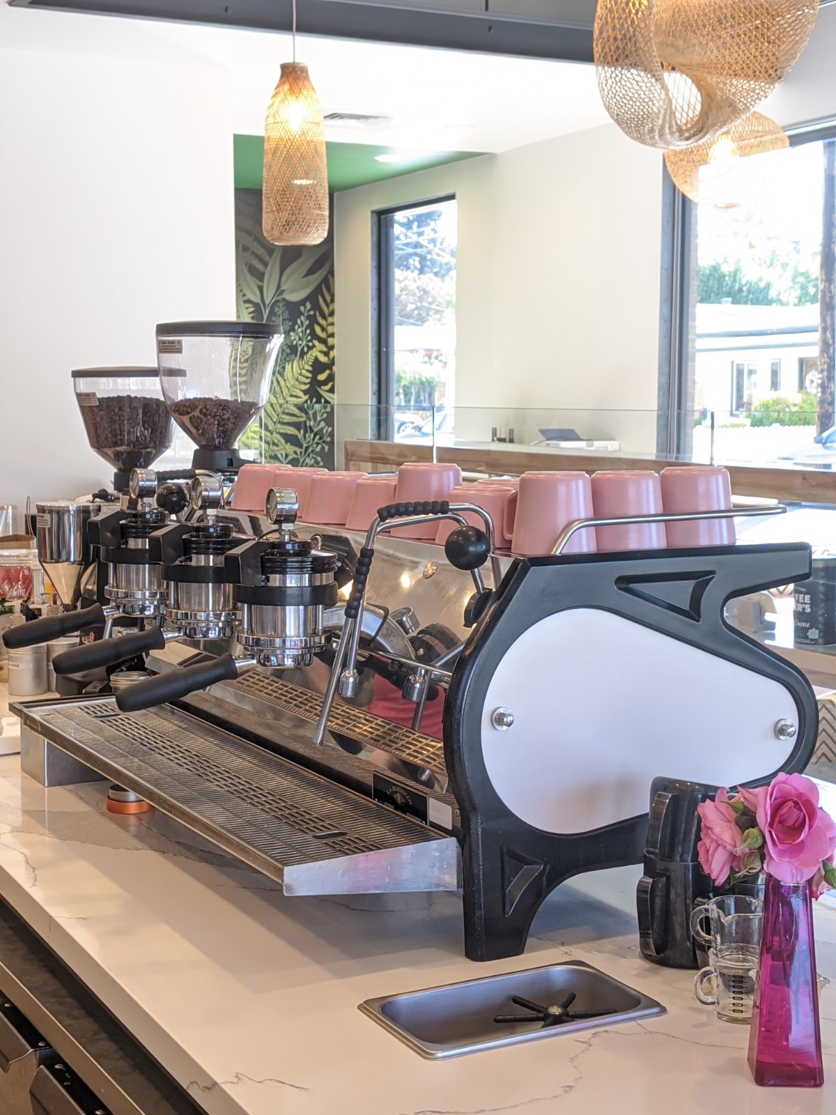 Above the white quartz service bar, a pattern of pinks emerges with a 3-group La Marzocco Strada MP espresso machine, matching pink hickory tables, pink chairs, and pink ceramics. The Strada is paired with a fleet of Mazzer Robur grinders alongside a Mahlkönig EK43 that grinds for Fetco batch brews.
