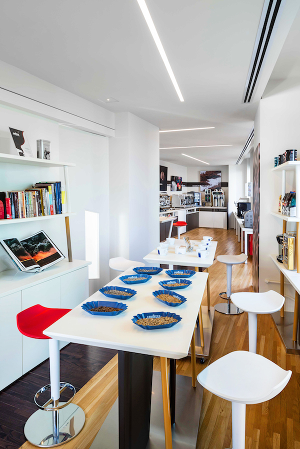 The showroom is the most public of the interior spaces, and MADGI says it was designed to “emulate an almost home-like atmosphere,” including white display cases for coffee-making equipment, books, and promotional items, The room is defined by a hardwood floor in contrasting natural wood and dark espresso stains, and two narrow white countertops that serve as meeting and display tables.