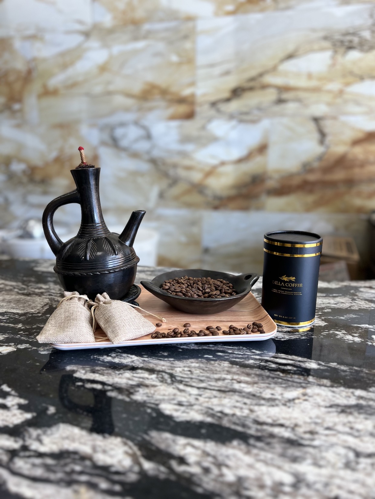 On Ross Avenue north of downtown Dallas, Dilla Coffee now welcomes guests with a curved cool granite counter, while roasted coffees are displayed in black canisters with gold trim. The shop offers tastings with modern pourover and drip methods, plus occasional demonstrations of the traditional Ethiopian buna ceremony. The owners are currently awaiting the arrival of an espresso machine.
